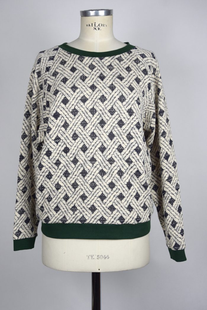 PULLOVER CHLOE | 1011 color: white/green material: 80%co 20%pa sizes: s/m/l sex: women Price: 119.00 € Pullover aus softer Baumwolle in Strickoptik mit Rundhalsausschnitt und weitem Raglan-Arm. Muster in dunkelblauer/cremeweißer Rautenoptik, grüne Baumwollbündchen //Farblich abgesetzte Bündchen in grün