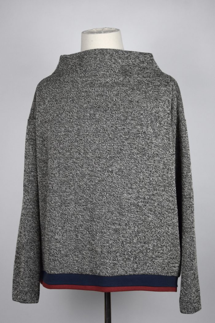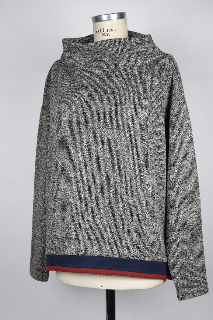 PULLOVER KNIGHT WOMEN | 1002 color: white / black material: 60%vi 20%ac 20%pl sizes: s/m/l sex: women Price: 148.00 € Melierter Oversize- Strickpullover mit U-Boot- Ausschnitt und schmalen Ärmeln // zweifarbige Baumwoll-Rippbündchen an Arm und Saum // Saum wird nach hinten länger // gedoppelter U-Boot-Ausschnitt sorgt für eine Stehkragen-Optik
