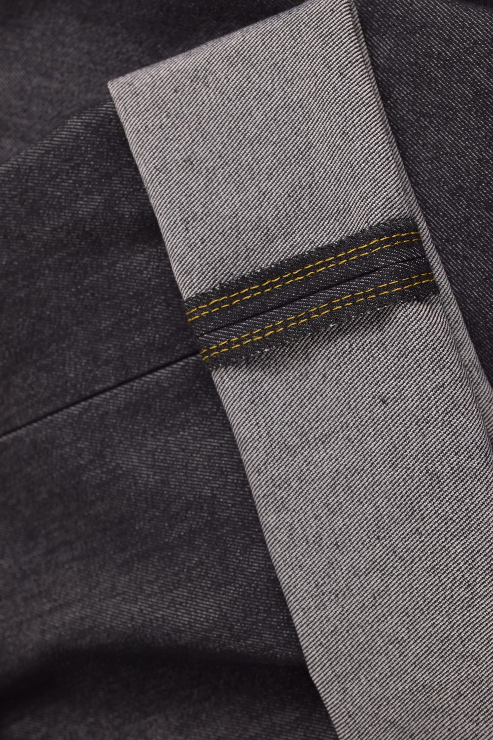 // nach vorne versetzte Beinnaht mit eingefassten Seitentaschen